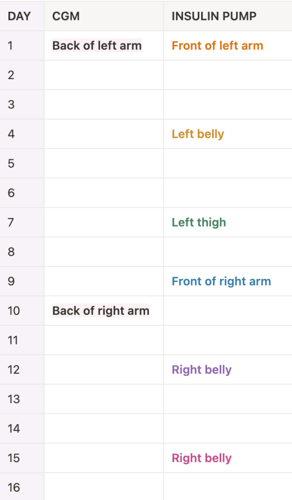 If you’re on insulin pen injections (multiple daily injections = MDI), maybe use this as your plan throughout the day. For example, use arm sites in the morning, belly sites in the afternoon, and leg sites in the evening. Although that’s easier said than done as when I was on MDI, I done a lot of injections in my belly and would randomly incorporate arms/legs..!